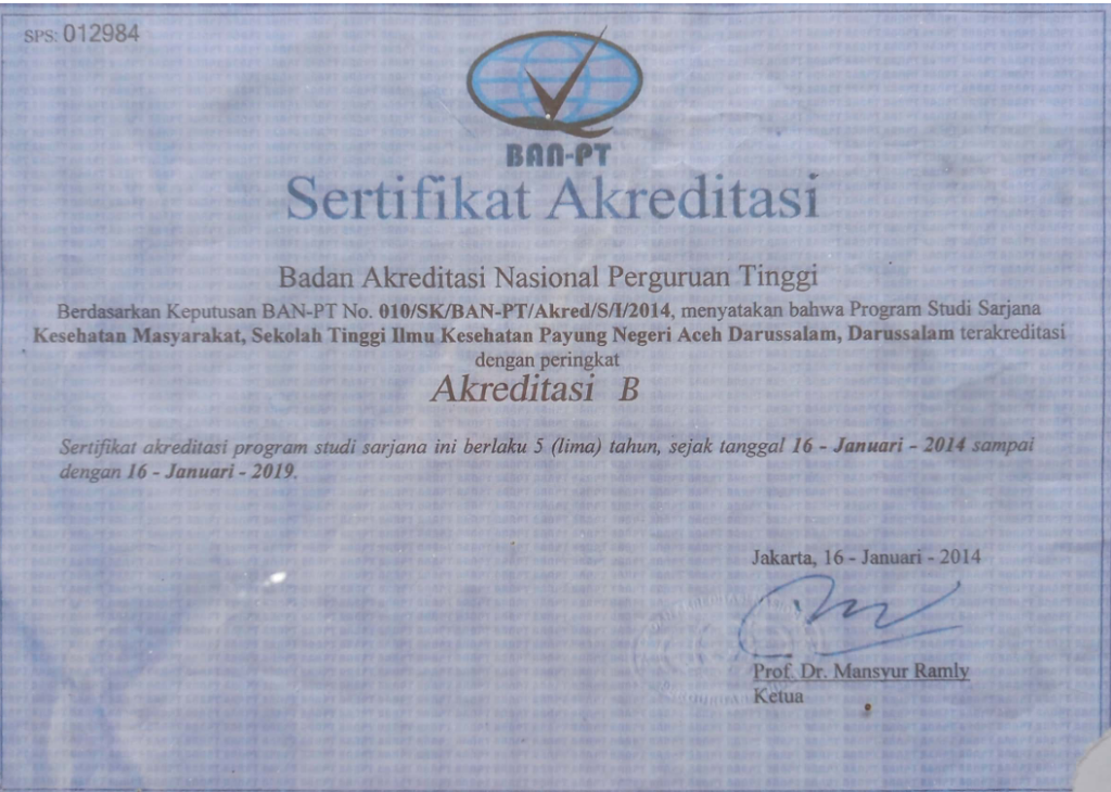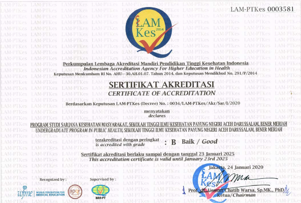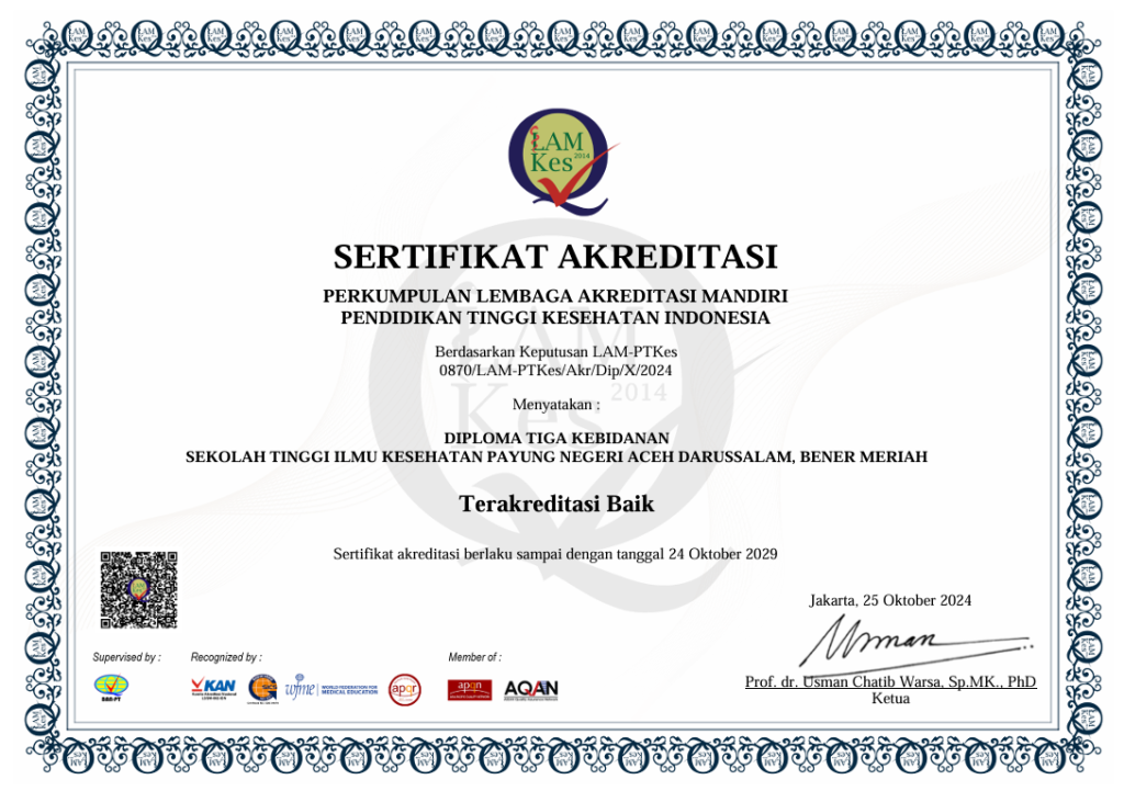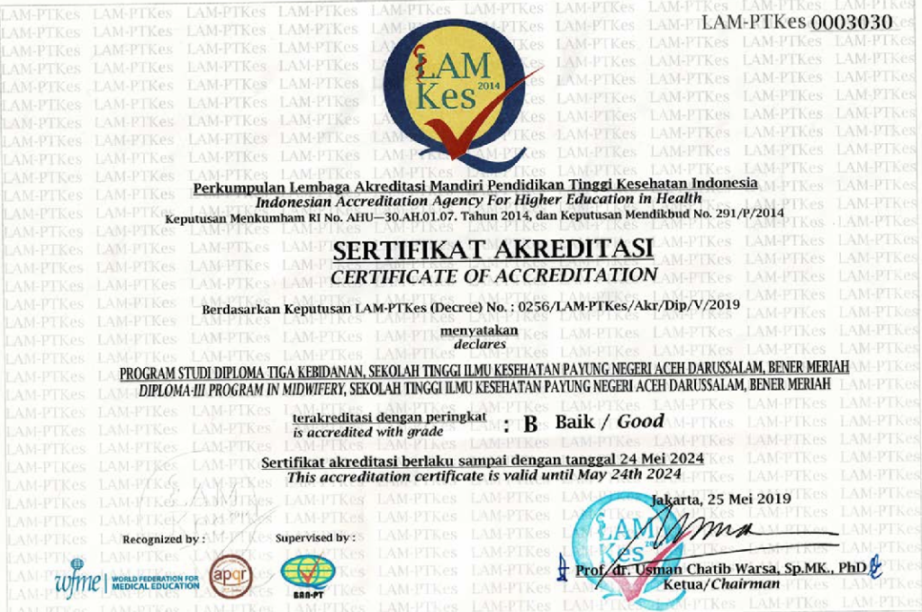 Sertifikat Akreditas Prodi Kesmas 2014 sertifikat akreditas DIII Kebidanan 2019 Sertifikat akreditas Prodi Kesmas 2020 Sertifikat Akreditas Institusi 2022 Sertifikat Akreditas Bidan 2024